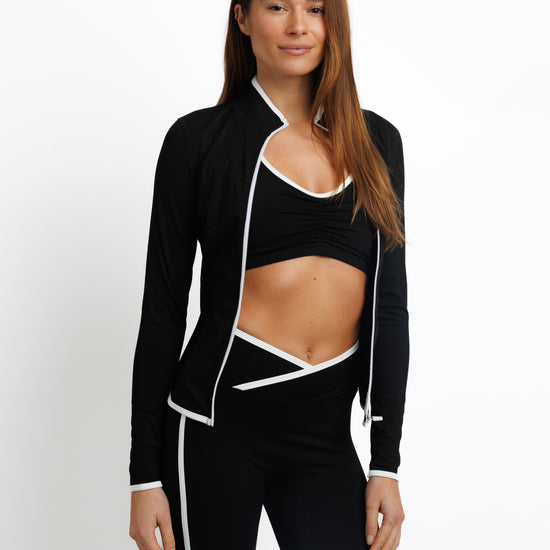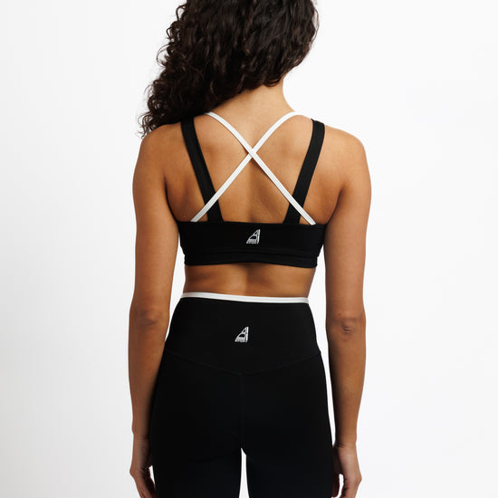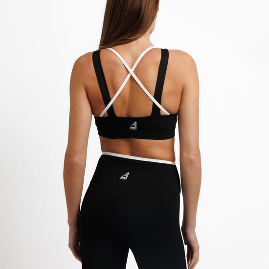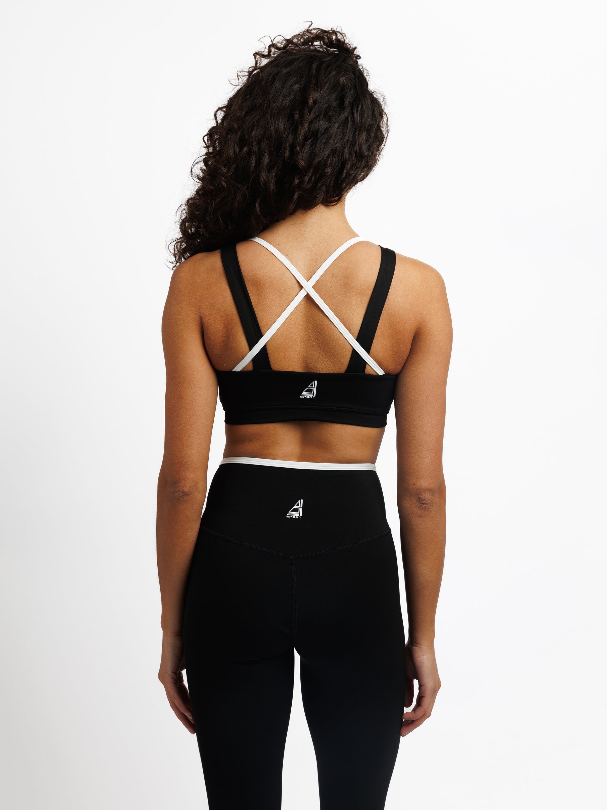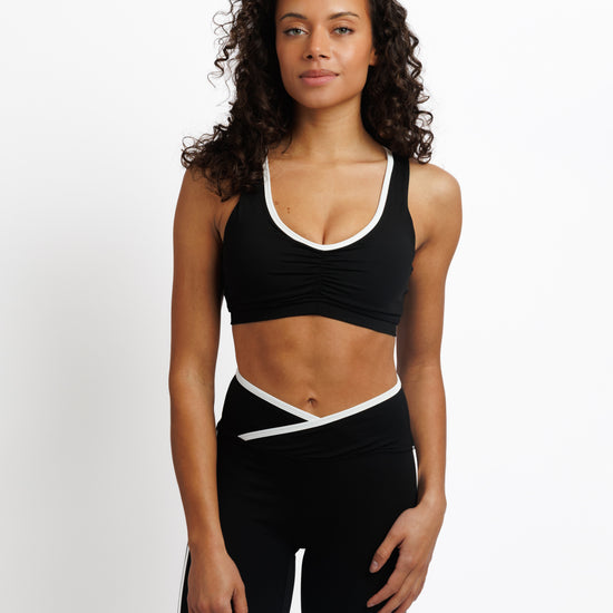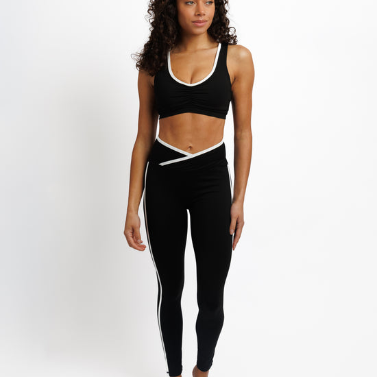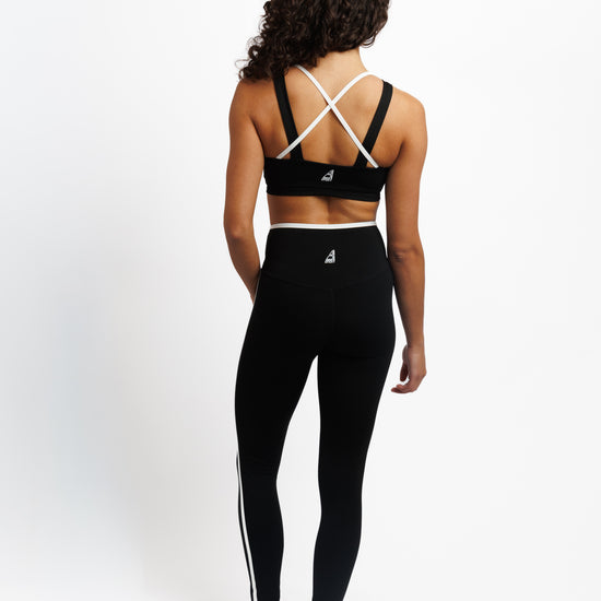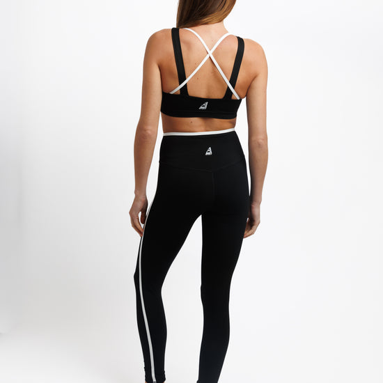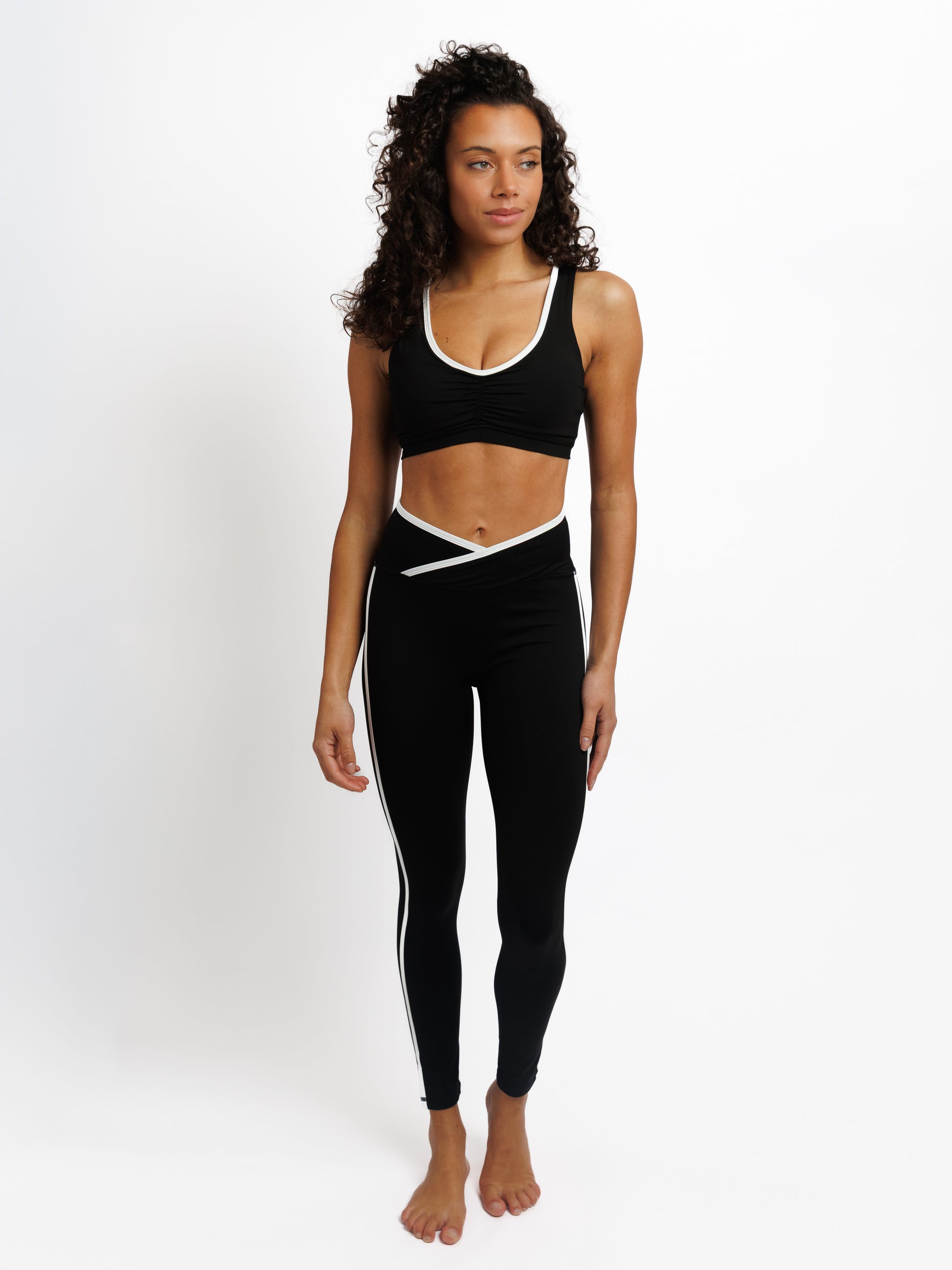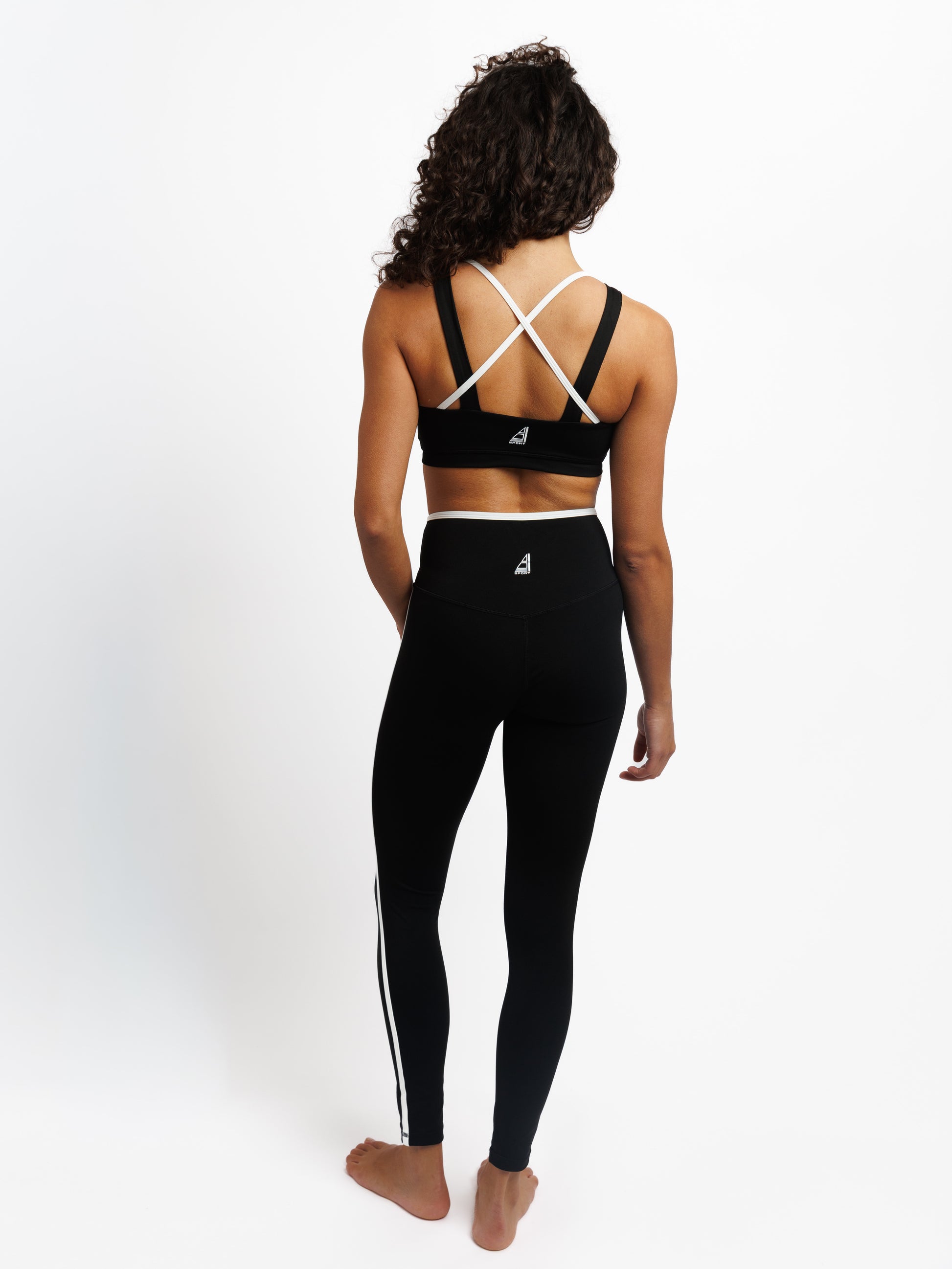 . This black legging features clean white side stripes for a sporty look and a flattering V-shaped front waistband that accentuates the waist and creates a sculpted silhouette.