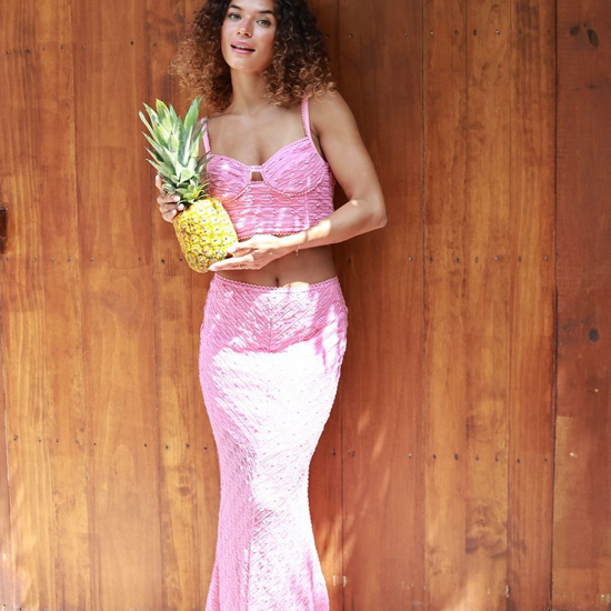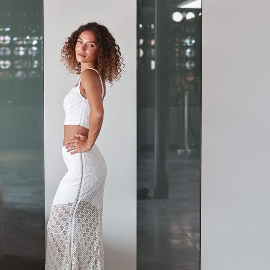 Romantic and refined, the Besame Set by Azur IBIZA features a breezy crochet-lace inspired fabric. With a flattering cropped top and flowing maxi skirt, this co-ord is perfect for sun-drenched days, sunset dinners, or dancing under the stars. A statement of effortless elegance.