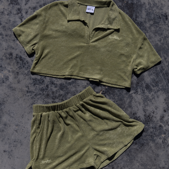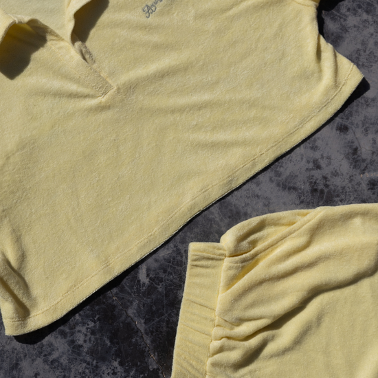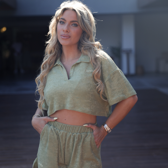 The Luna Set features a cropped towel shirt with short sleeves, a flattering V-neckline, and collar — paired with matching shorts. Finished with subtle Azur Ibiza detailing, it’s your go-to for beach days, poolside lounging, or sunset strolls.