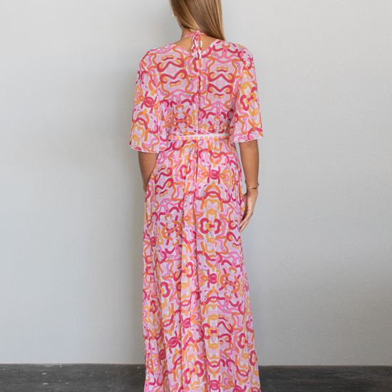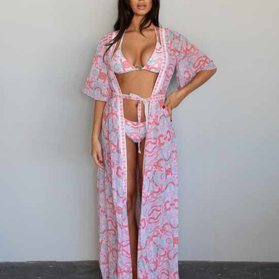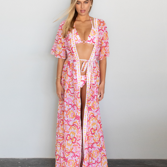 Complete your beach look with the matching Mariposa Dress, featuring the same enchanting print. This dress is perfect for a seamless transition from the beach to a casual evening out.