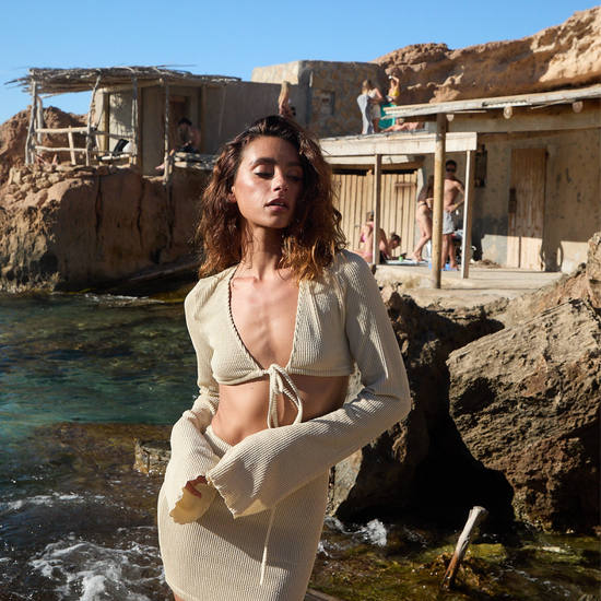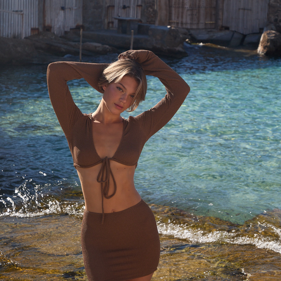 Introducing the Xarra Set, the ultimate in effortless beach chic. Crafted from a luxurious lurex fabric, this set is designed to shine under the sun while providing comfort and style. The top features a unique adjustable tie design, allowing you to knot it between your bust for a customizable fit that flatters your natural shape. Paired with a stretchy fabric skirt, this set moves with you, ensuring a comfortable and flexible fit as you lounge or stroll along the beach.